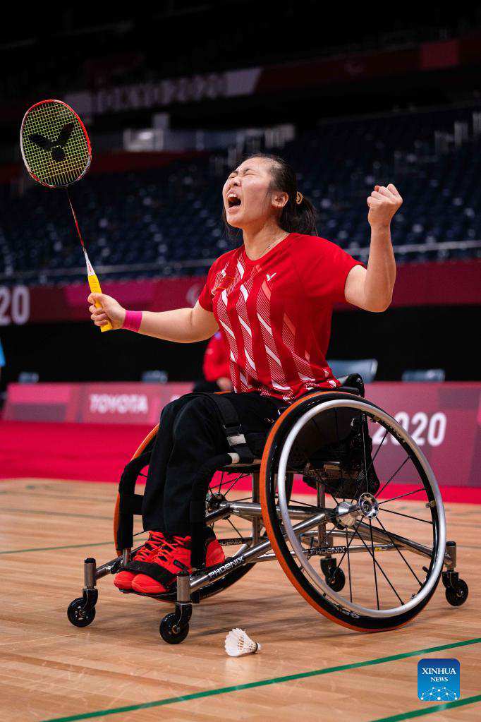 China's Yin Menglu celebrates during the women's singles WH1 match of badminton event at the Tokyo 2020 Paralympic Games in Tokyo, Japan, Sept. 2, 2021. (Xinhua/Cheong Kam Ka)