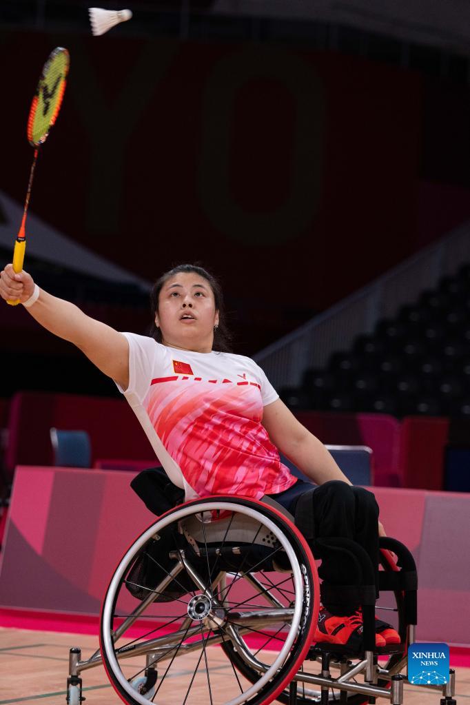China's Zhang Jing competes during the women's singles WH1 match of badminton event against Cynthia Mathez of Switzerland at the Tokyo 2020 Paralympic Games in Tokyo, Japan, Sept. 2, 2021. (Xinhua/Cheong Kam Ka)