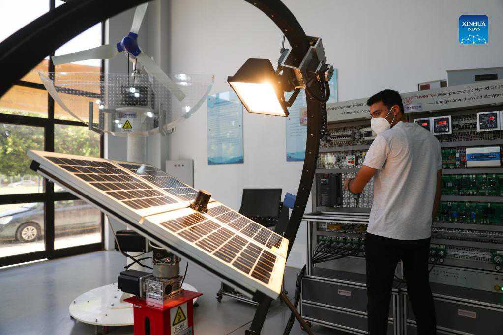 A trainee learns simulated wind-photovoltaic hybrid generating system at New Energy Technology Training Area of Luban Workshop at Ain Shams University in Cairo, Egypt, Aug. 16, 2021. (Xinhua/Sui Xiankai)