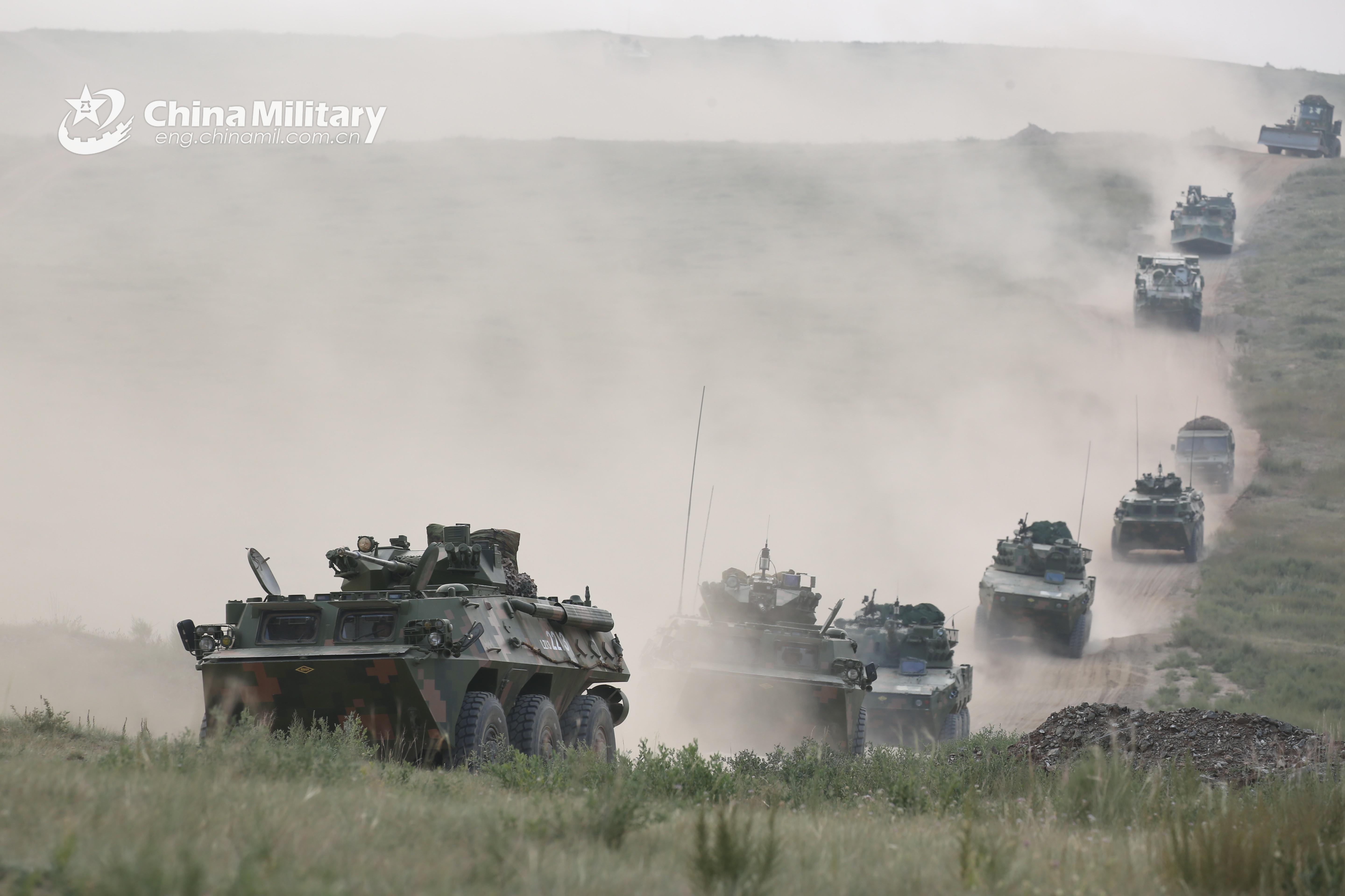A group of armored vehicles attached to a combined arms brigade under the PLA 81st Group Army maneuver on dirt roads in speed to a designated training base for a tactical test on August 12, 2021. (eng.chinamil.com.cn/Photo by Xue Wei)