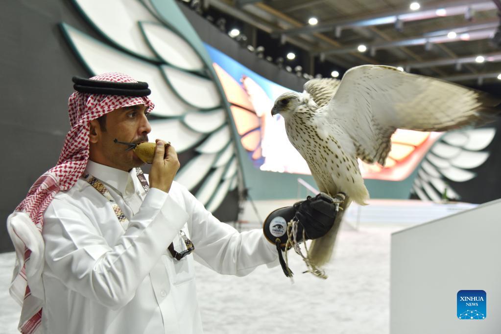 A worker shows a falcon to visitors at the Saudi Falcons Club Grounds in Riyadh, Saudi Arabia, Sept. 1, 2021. The international falcon breeders auction, which will run from August 5th until September 5th, is being organized by the Saudi Falcons Club with the participation of top falconers from around the world. (Xinhua/Wang Haizhou)