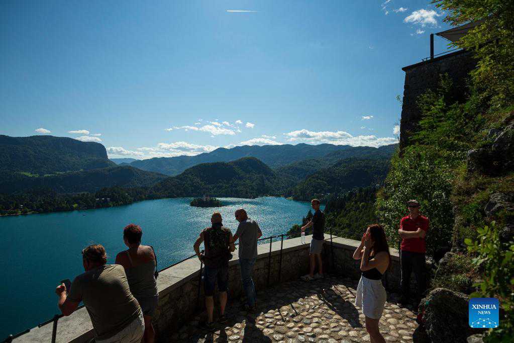 Visitors overlook Bled lake from Bled castle in Slovenia, Sept. 1, 2021. Bled lake is one of the most attractive tourist destinations in Slovenia. (Photo by Zeljko Stevanic/Xinhua)