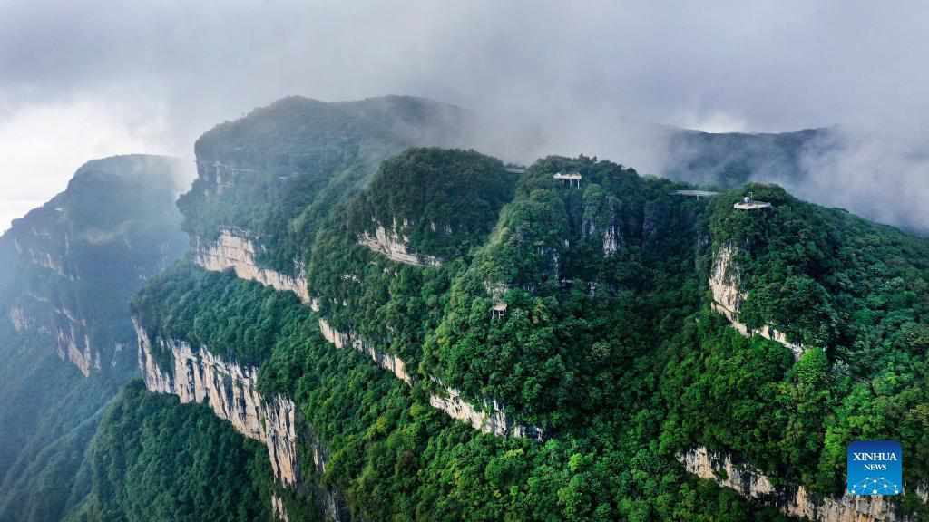 Aerial photo taken on Sept. 2, 2021 shows the scenery of Longtoushan scenic area shrouded in clouds in Nanzheng District of Hanzhong, northwest China's Shaanxi Province. (Xinhua/Tao Ming)