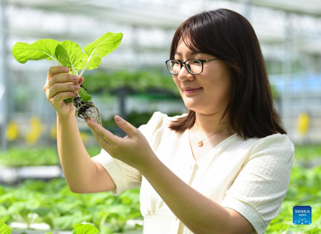 Mandy Tam checks the growth of vegetables at her aquaponics production base in the national agricultural demonstration zone in Kaiping City, Jiangmen, south China's Guangdong Province, on Sept. 2, 2021. Victor Lo, Fung Leung and Mandy Tam, all born in the 1990s in Hong Kong, south China, came to the Kaiping national agricultural demonstration zone for their aquaponics research. Aquaponics is a forefront agricultural technology that combines fish-farming and vegetable-gardening, noted for its organic and eco-friendly production cycles, high output, and low energy consumption. With five years of research, the team managed to crack quite a few bottlenecks in the field and applied for nearly 10 patents. Thanks to support from the demonstration zone, they started an aquaponics production base and incorporated their own business. To date, the base annually yields some 300 tonnes of organic vegetables, most of them sold to Hong Kong. The trio said they owe their success to the development of the Guangdong-Hong Kong-Macao Greater Bay Area, and have full confidence in its future. (Xinhua/Deng Hua)