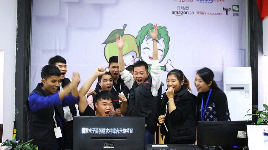 E-commerce entrepreneurs celebrate as an online order was clinched in Rong'an County, south China's Guangxi Zhuang Autonomous Region, May 8, 2021. (Xinhua/Zhang Ailin)