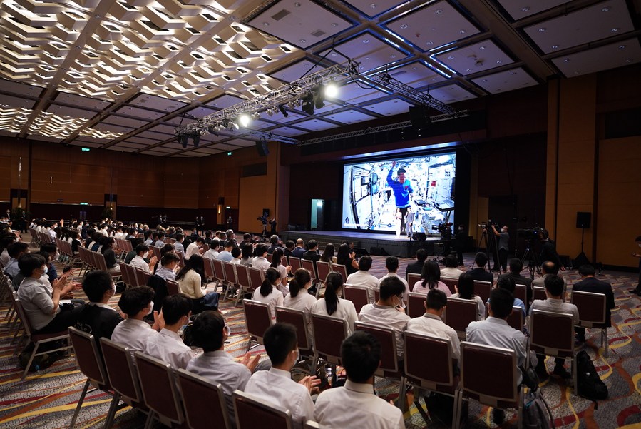 HONG KONG, Sept. 3 (Xinhua) -- "Hong Kong is calling the Shenzhou-12 spaceship." "Hello, friends from Hong Kong!" With applause and cheers resounding through the Hong Kong Convention and Exhibition Center on Friday, three Chinese astronauts talked with nearly 300 Hong Kong researchers, teachers and students from space via video link.