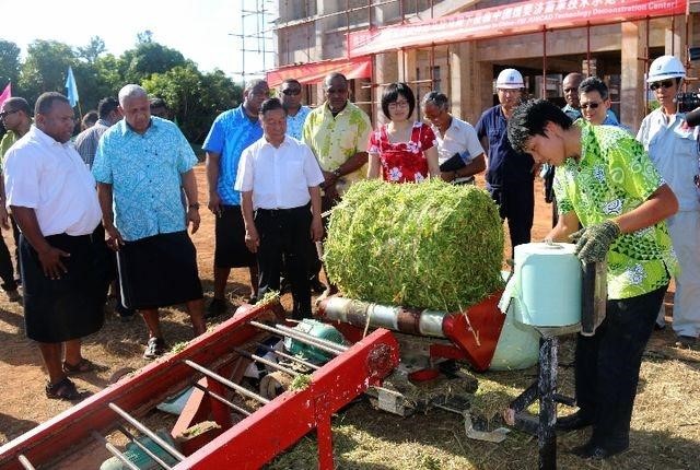 Chief scientist Lin Zhanxi of China National Engineering Research Center of Juncao Technology, Fujian Agriculture and Forestry University, shows how to process Juncao to local farmers in Fiji at the fifth workshop of the China-Fiji Juncao Technology Cooperation Project. (Photo provided by Lin Zhanxi)