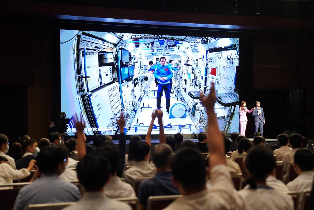 Hong Kong youth raise hands to ask Chinese astronauts on board the Tiangong space station questions during a real-time video dialogue with the taikonauts in Hong Kong on Sept 3, 2021. (Photo/Xinhua)