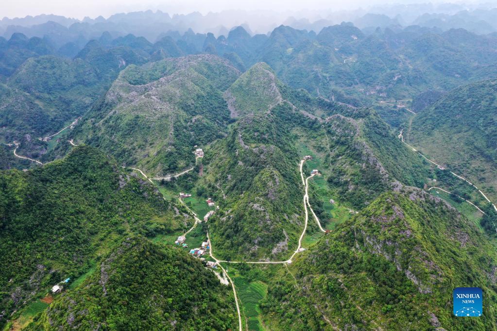 Aerial photo taken on Sept. 1, 2021 shows mountain roads in Jiahe Village, Jingsheng Township of Du'an Yao Autonomous County, south China's Guangxi Zhuang Autonomous Region. Du'an is known as the "rocky kingdom" as 89 percent of its administrative region is covered by karst mountains. Poor transportation infrastructure blocked people from the outside and trapped the mountain dwellers in extreme poverty for generations. In recent years, Du'an has invested a lot in upgrading roads in rural areas. The county has seen an expanded road network. As China advances rural vitalization following its eradication of absolute poverty, improved rural roads have helped farmers dispatch their goods and brought tourists and other resources, facilitating the development of industries including e-commerce, tourism and agriculture with local characteristics. (Xinhua/Lu Boan)