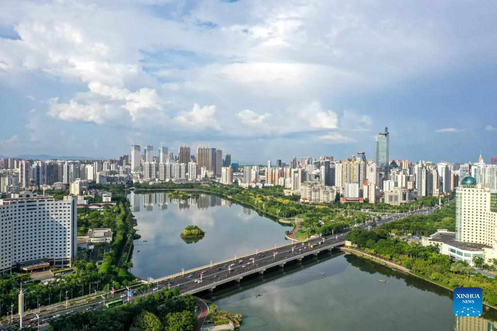 Aerial photo taken on Sept. 5, 2021 shows the view of rainbow in Nanning, south China's Guangxi Zhuang Autonomous Region. (Xinhua/Cao Yiming)