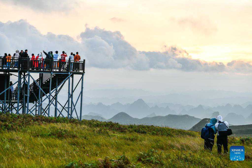 Tourists view the sunrise at a scenic spot in Hezhang County, southwest China's Guizhou Province, Sept. 4, 2021. Hezhang County, featuring beautiful natural scenery and distinctive culture, has ramped up efforts in improving tourism facilities and boosting tourism industry in recent years. Tourism development of the county has given impetus to its rural revitalization. Statistics show that the county has received 4.34 million visitor trips from January to August this year. (Xinhua/Yang Wenbin)