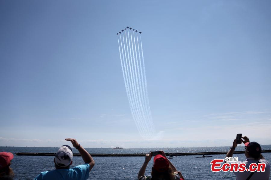 The Canadian Forces Snowbirds perform during the 2021 Canadian International Air Show in Toronto, Canada, on Sept. 4, 2021.(Photo/China News Service/Yu Ruidong)