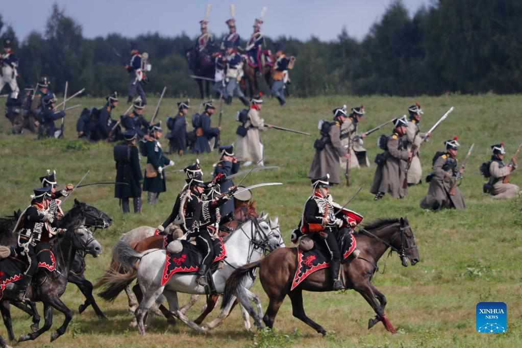 Participants take part in the reenactment of the 1812 Battle of Borodino between Russia and the invading French army near the Borodino village, outside Moscow, Russia, on Sept. 5, 2021. (Photo by Alexander Zemlianichenko Jr/Xinhua)
