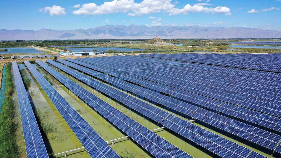 Aerial photo taken on Aug. 24, 2021 shows photovoltaic panels at a fish breeding base in Helan County of Yinchuan, northwest China's Ningxia Hui Autonomous Region. (Xinhua/Wang Peng)