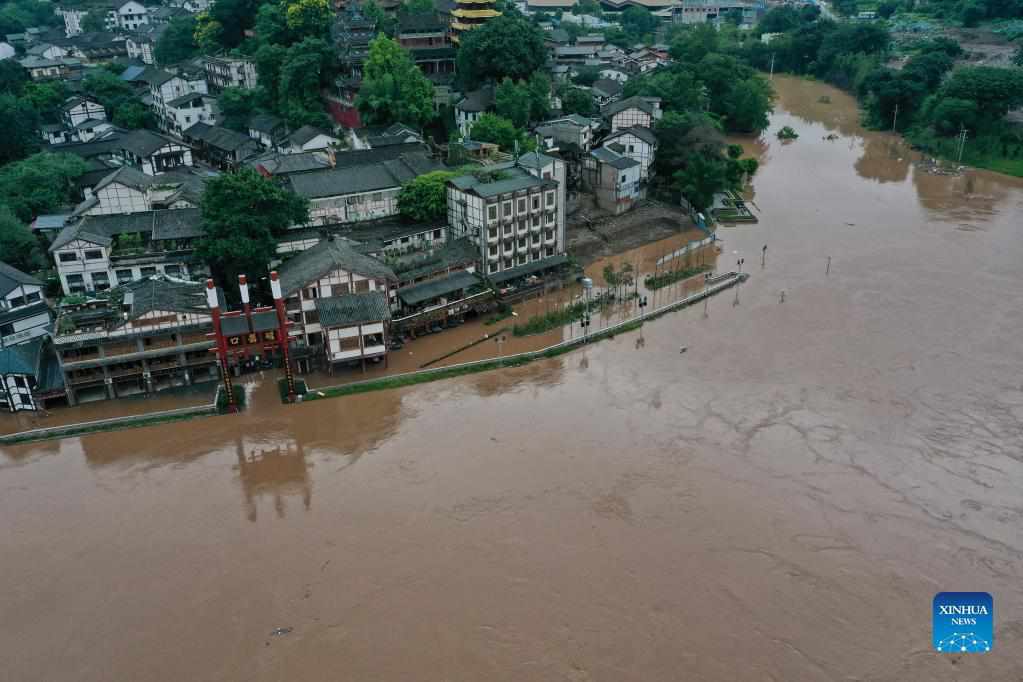 Aerial photo taken on Sept. 6, 2021 shows the flood-affected area in Ciqikou, southwest China's Chongqing Municipality. The emergency response for flood control was upgraded from level IV to III on Monday, according to Chongqing's flood control and drought relief headquarters, as Jialing River in Chongqing witnessed rapidly increasing water levels following constant heavy rainfall. (Xinhua/Wang Quanchao)