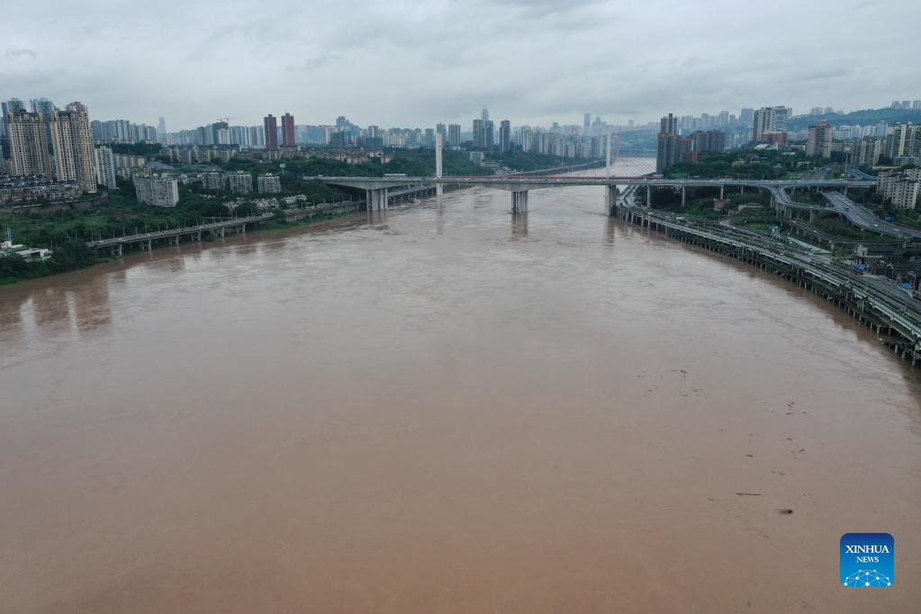 Aerial photo taken on Sept. 6, 2021 shows the flood-affected area in southwest China's Chongqing Municipality. The emergency response for flood control was upgraded from level IV to III on Monday, according to Chongqing's flood control and drought relief headquarters, as Jialing River in Chongqing witnessed rapidly increasing water levels following constant heavy rainfall. (Xinhua/Wang Quanchao)
