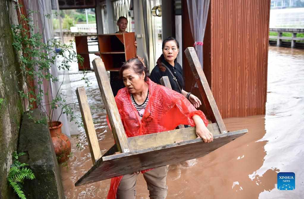 Local citizens transfer furniture to safe place in Ciqikou ancient town, southwest China's Chongqing Municipality, Sept. 6, 2021. The emergency response for flood control was upgraded from level IV to III on Monday, according to Chongqing's flood control and drought relief headquarters, as Jialing River in Chongqing witnessed rapidly increasing water levels following constant heavy rainfall. (Xinhua/Wang Quanchao)