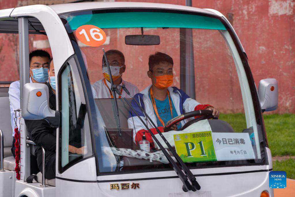 A staff member (1st R) drives a ferry bus at the Shougang Park during the 2021 China International Fair for Trade in Services (CIFTIS) in Beijing, capital of China, Sept. 6, 2021. (Xinhua/Xu Qin)