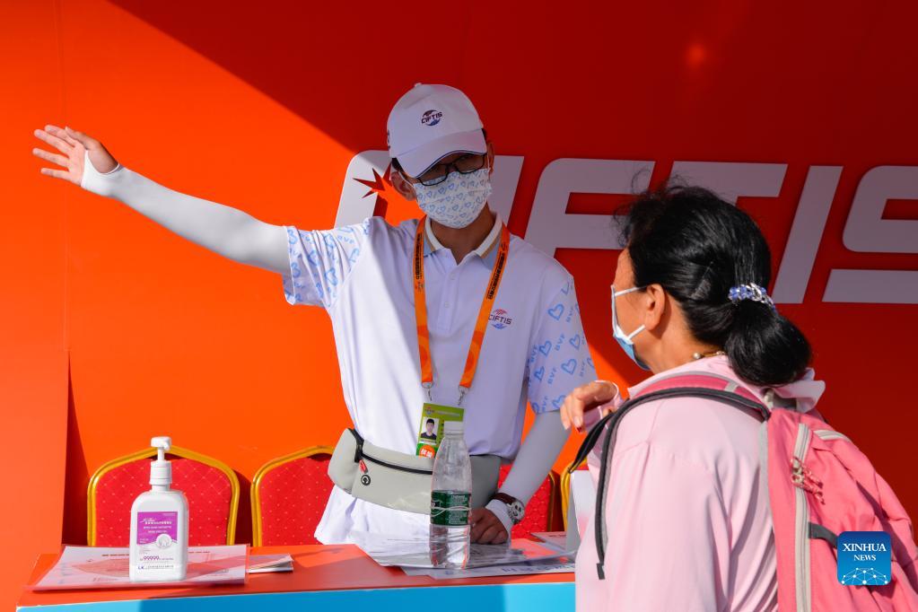 A volunteer shows a visitor the way at the Shougang Park during the 2021 China International Fair for Trade in Services (CIFTIS) in Beijing, capital of China, Sept. 6, 2021. (Xinhua/Xu Qin)