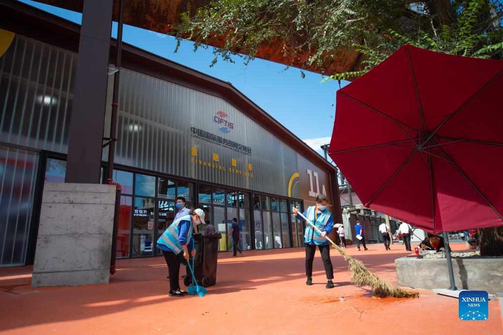 Sanitation workers clean the floor in front of the Financial Services exhibition hall during the 2021 China International Fair for Trade in Services (CIFTIS) in Beijing, capital of China, Sept. 6, 2021. (Xinhua/Chen Zhonghao)