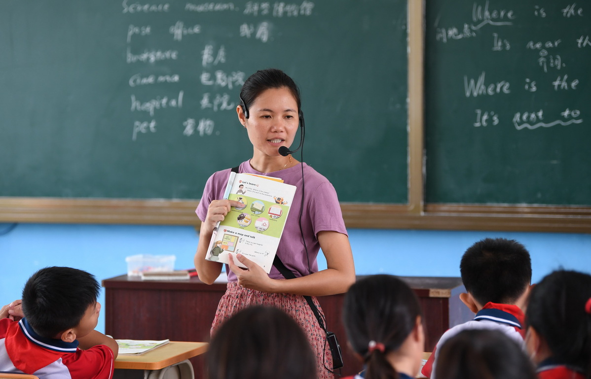 A teacher teaches English at Beili elementary school in Xuwen county, South China's Guangdong province on Sept 1, 2020. (Photo/Xinhua)