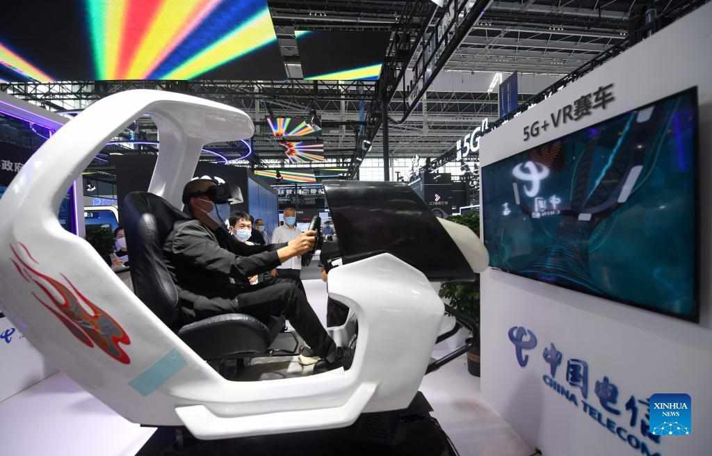 A man experiences a 5G+VR racing cockpit at the China International Digital Economy Expo 2021 in Shijiazhuang, north China's Hebei Province, Sept. 6, 2021. Themed "innovative development and digital economy," the China International Digital Economy Expo 2021 was kicked off on Monday and will last until Sept. 8. The expo will focus on new business models, new patterns and hot topics in the digital economy, highlighting the coordinated development of the Beijing-Tianjin-Hebei region, the planning and construction of Xiong'an New Area and the preparation of the 2022 Winter Olympics. (Xinhua/Wang Xiao)