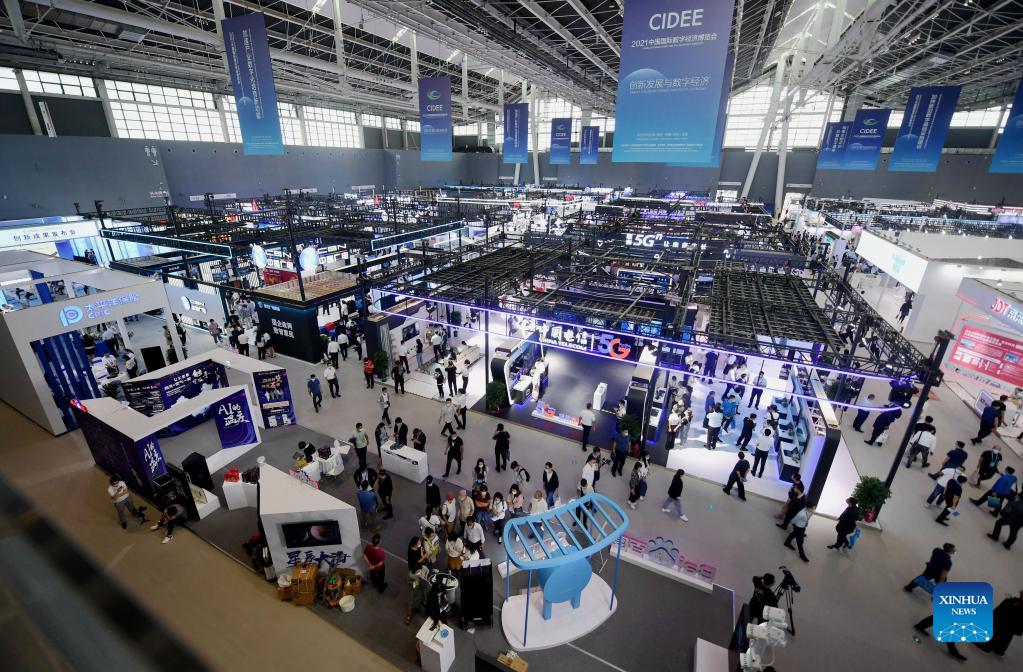 Photo taken on Sept. 6, 2021 shows a view of the China International Digital Economy Expo 2021 in Shijiazhuang, north China's Hebei Province. Themed "innovative development and digital economy," the China International Digital Economy Expo 2021 was kicked off on Monday and will last until Sept. 8. The expo will focus on new business models, new patterns and hot topics in the digital economy, highlighting the coordinated development of the Beijing-Tianjin-Hebei region, the planning and construction of Xiong'an New Area and the preparation of the 2022 Winter Olympics. (Xinhua/Wang Xiao)