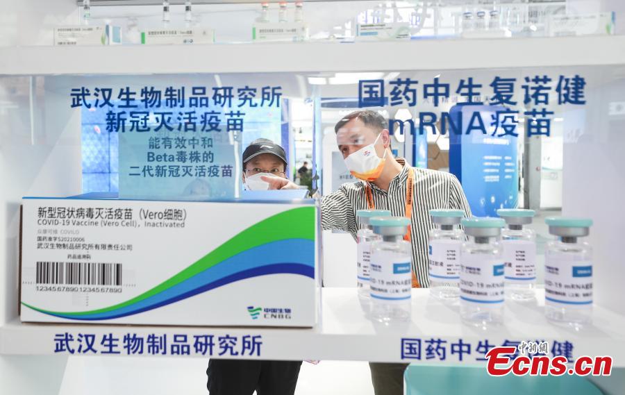Photo shows two second-generation vaccines against coronavirus variants developed by China's Sinopharm at 2021 China International Fair for Trade in Services (CIFTIS), Beijing, Sept. 6, 2021. (Photo: China News Service/Jia Tianyong)