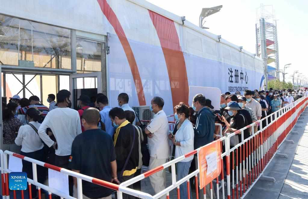 Visitors queue up outside the National Convention Center to pick up the tickets during the 2021 China International Fair for Trade in Services (CIFTIS) in Beijing, capital of China, on Sept. 7, 2021. The six-day 2021 China International Fair for Trade in Services (CIFTIS) is coming to a close on Tuesday, with businesses wrapping up their exhibitions of products and services offline and online, and industry leaders finalizing their thematic conferences. (Xinhua/Wu Wei)