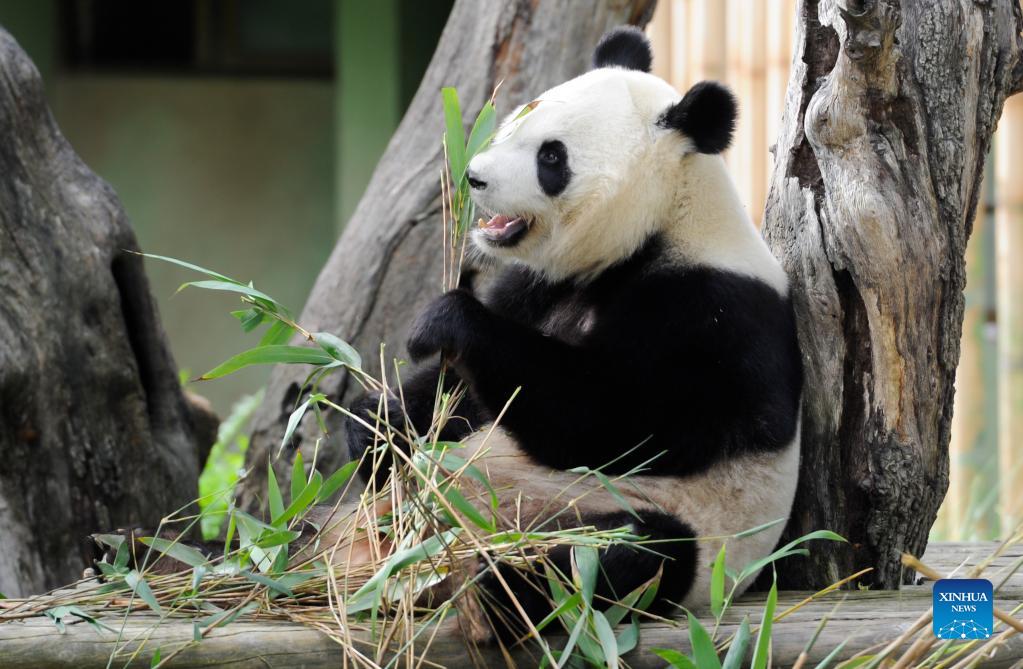 Photo taken on Sept. 7, 2021 shows a giant panda in Zoo Aquarium in Madrid, Spain. Two giant panda cubs born in the Madrid Zoo Aquarium on Monday were doing fine and in good health, according to the zoo authorities on Tuesday. It is still too early to confirm the sexes of the baby pandas, said the zoo, expecting for help from two specialists from China's Chengdu Research Base of Giant Panda Breeding. (Photo by Gustavo Valiente/Xinhua)