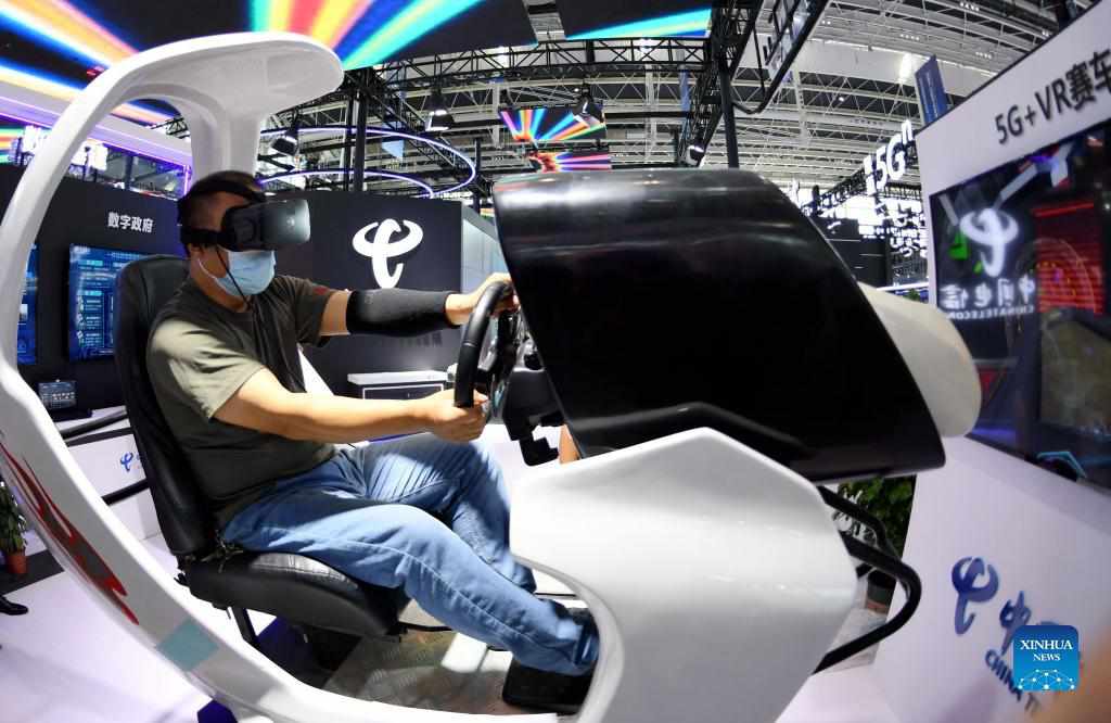 A man experiences a 5G+VR racing cockpit at the China International Digital Economy Expo 2021 in Shijiazhuang, north China's Hebei Province, Sept. 7, 2021. Themed "innovative development and digital economy," the China International Digital Economy Expo 2021 kicked off on Monday and will last until Sept. 8. The expo focuses on new business models, new patterns and hot topics in the digital economy, highlighting the coordinated development of the Beijing-Tianjin-Hebei region, the planning and construction of Xiong'an New Area and the preparation of the 2022 Winter Olympics. (Xinhua/Wang Xiao)