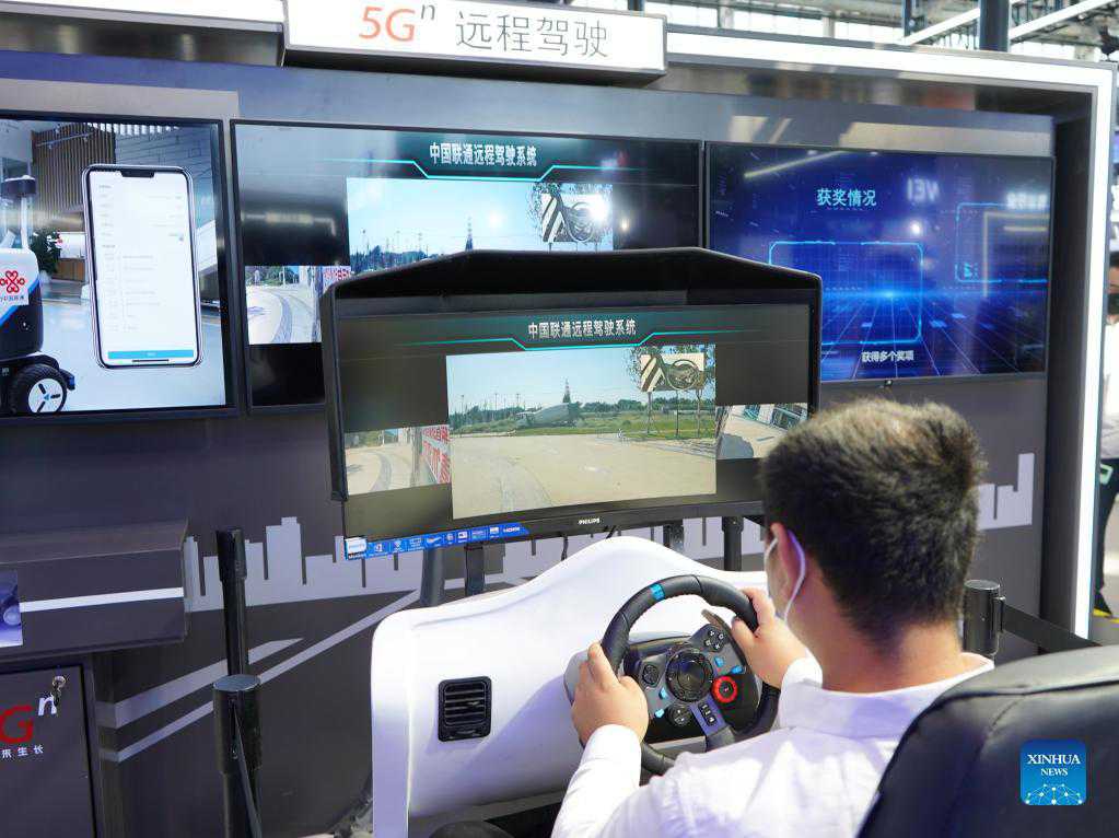 A staff member displays a tele-operated 5G driving system powered at the China International Digital Economy Expo 2021 in Shijiazhuang, north China's Hebei Province, Sept. 7, 2021. Themed "innovative development and digital economy," the China International Digital Economy Expo 2021 kicked off on Monday and will last until Sept. 8. The expo focuses on new business models, new patterns and hot topics in the digital economy, highlighting the coordinated development of the Beijing-Tianjin-Hebei region, the planning and construction of Xiong'an New Area and the preparation of the 2022 Winter Olympics. (Xinhua/Jin Haoyuan)