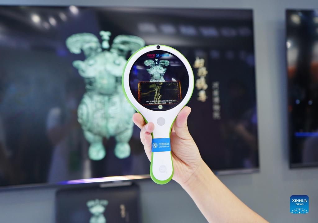 A staff member displays an AR device for information about cultural relics at the China International Digital Economy Expo 2021 in Shijiazhuang, north China's Hebei Province, Sept. 7, 2021. Themed "innovative development and digital economy," the China International Digital Economy Expo 2021 kicked off on Monday and will last until Sept. 8. The expo focuses on new business models, new patterns and hot topics in the digital economy, highlighting the coordinated development of the Beijing-Tianjin-Hebei region, the planning and construction of Xiong'an New Area and the preparation of the 2022 Winter Olympics. (Xinhua/Jin Haoyuan)