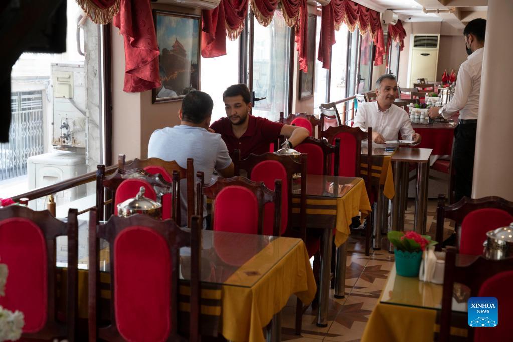 Turkish customers are seen at a Chinese restaurant where Chinese chef Shen Hu works in Istanbul, Turkey, on Sept. 2, 2021. (Photo by Osman Orsal/Xinhua)