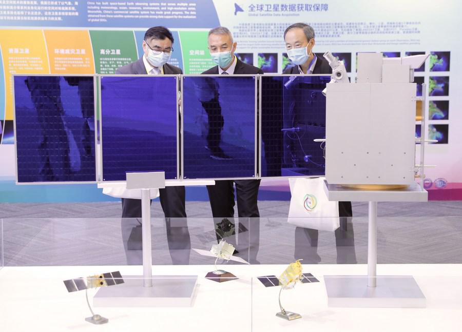 People visit a satellite model on an exhibition featuring big data and sustainable development goals in Beijing, capital of China, Sept. 6, 2021. (Xinhua/Jin Liwang)