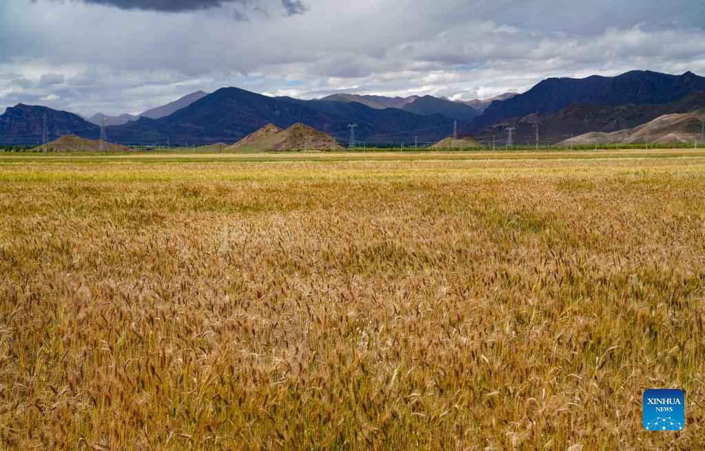 Photo taken on Sept. 6, 2021 shows the ripe highland barley in Lhunzhub County of Lhasa, capital of southwest China's Tibet Autonomous Region. (Xinhua/Jigme Dorje)