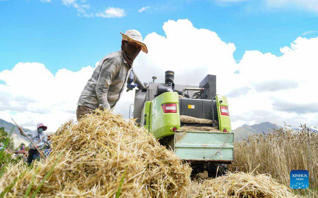 Farmers harvest highland barley at Kere Village of Dagze District, Lhasa, capital of southwest China's Tibet Autonomous Region, Sept. 6, 2021. (Xinhua/Jigme Dorje)
