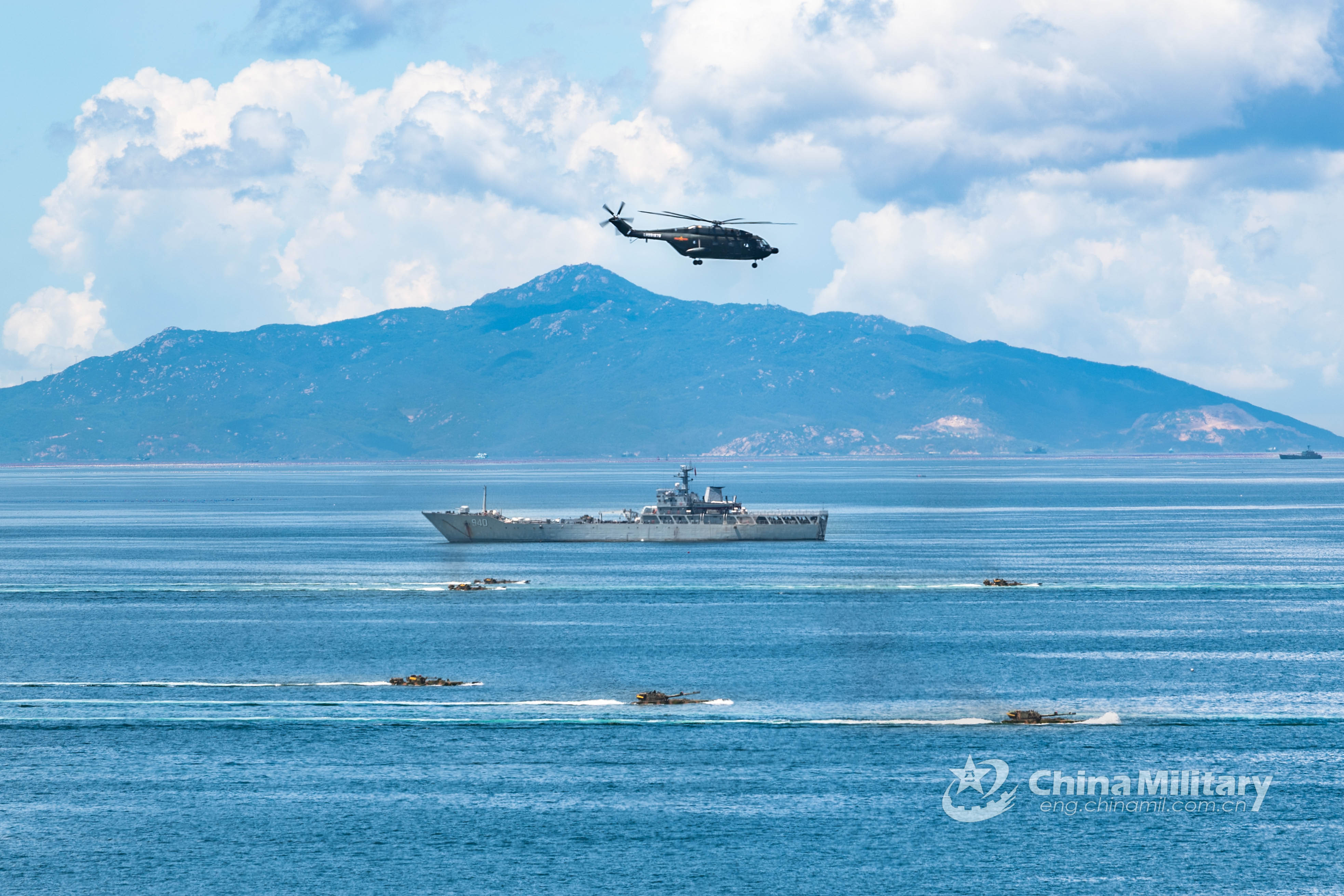 The military helicopter and the amphibious armored vehicles attached to a combined-arms brigade under the PLA Eastern Theater Command coordinate to rush toward the beach-head during the landing training on September 4, 2021. (eng.chinamil.com.cn/Photo by Lai Qiaoquan)