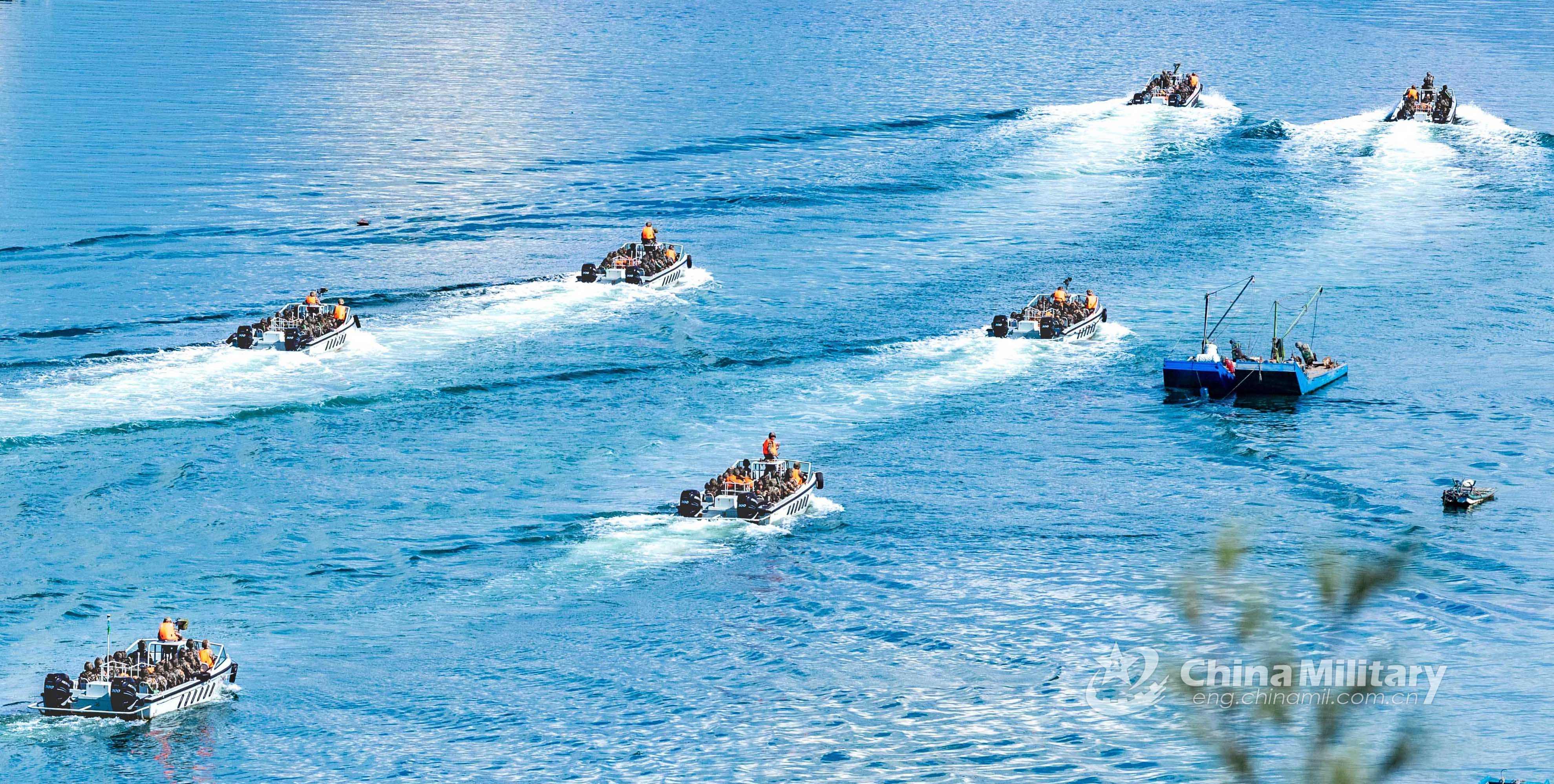 A group of landing crafts attached to a combined-arms brigade of the army under the PLA Eastern Theater Command make their ways to the beach-head during the landing training on September 4, 2021. (eng.chinamil.com.cn/Photo by Lai Qiaoquan)