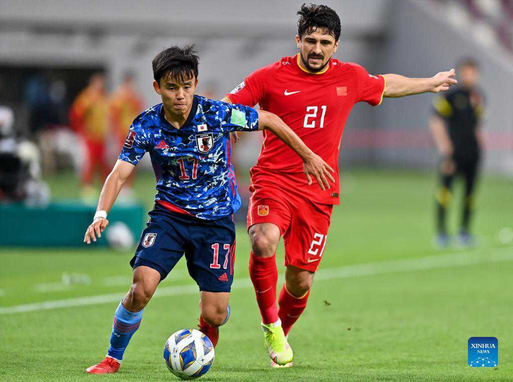 Luo Guofu (R) of China vies with Kubo Takefusa of Japan during the FIFA World Cup Qatar 2022 Asian qualification football match between China and Japan in Doha, Qatar, Sept. 7, 2021. (Photo by Nikku/Xinhua)