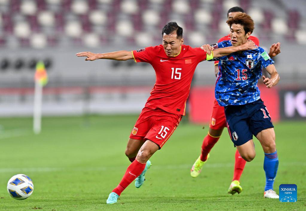 Wu Xi (front, L) of China vies with Osako Yuya (front, R) of Japan during the FIFA World Cup Qatar 2022 Asian qualification football match between China and Japan in Doha, Qatar, Sept. 7, 2021. (Photo by Nikku/Xinhua)
