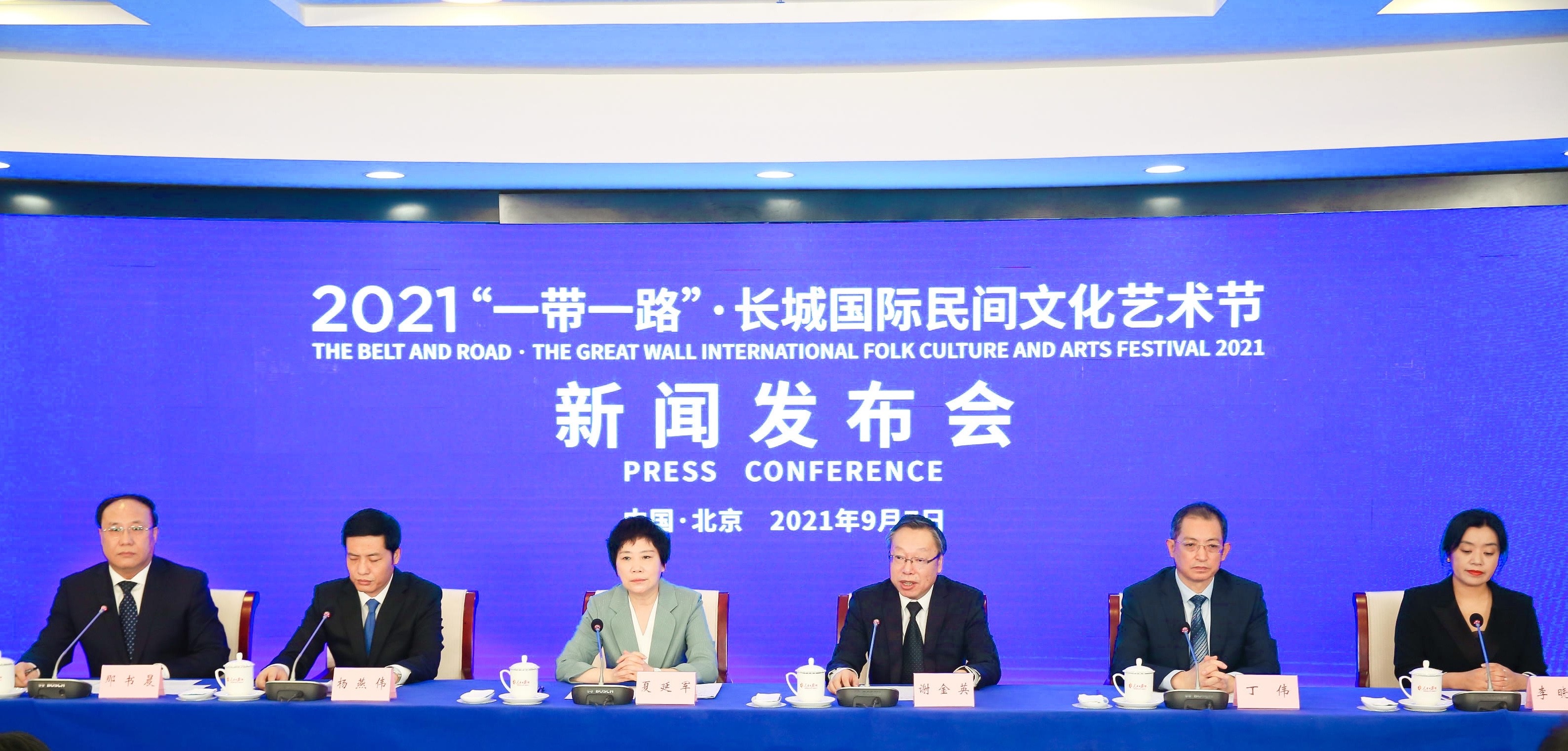 A news conference for the 2021 “Belt and Road” Great Wall International Folk Culture and Arts Festival is held on Sept. 7 in Beijing. (Photo/People's Daily Online)