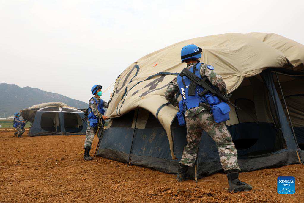 Peacekeepers participate in an international peacekeeping drill at a combined-arms tactical training base of the Chinese People's Liberation Army (PLA) in central China's Henan Province, Sept. 7, 2021. China started holding an international peacekeeping drill code-named "Shared Destiny-2021" on Sept. 6. Drills of battlefield reconnaissance, security guarding and patrol, armed escort, protection of civilians, response to violent and terrorist attacks, construction of temporary operation base, battlefield first aid, and pandemic control are expected to be conducted. (Xinhua/Liu Fang)
