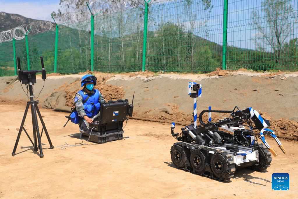 A peacekeeper participates in an international peacekeeping drill at a combined-arms tactical training base of the Chinese People's Liberation Army (PLA) in central China's Henan Province, Sept. 8, 2021. China started holding an international peacekeeping drill code-named "Shared Destiny-2021" on Sept. 6. Drills of battlefield reconnaissance, security guarding and patrol, armed escort, protection of civilians, response to violent and terrorist attacks, construction of temporary operation base, battlefield first aid, and pandemic control are expected to be conducted. (Xinhua/Liu Fang)