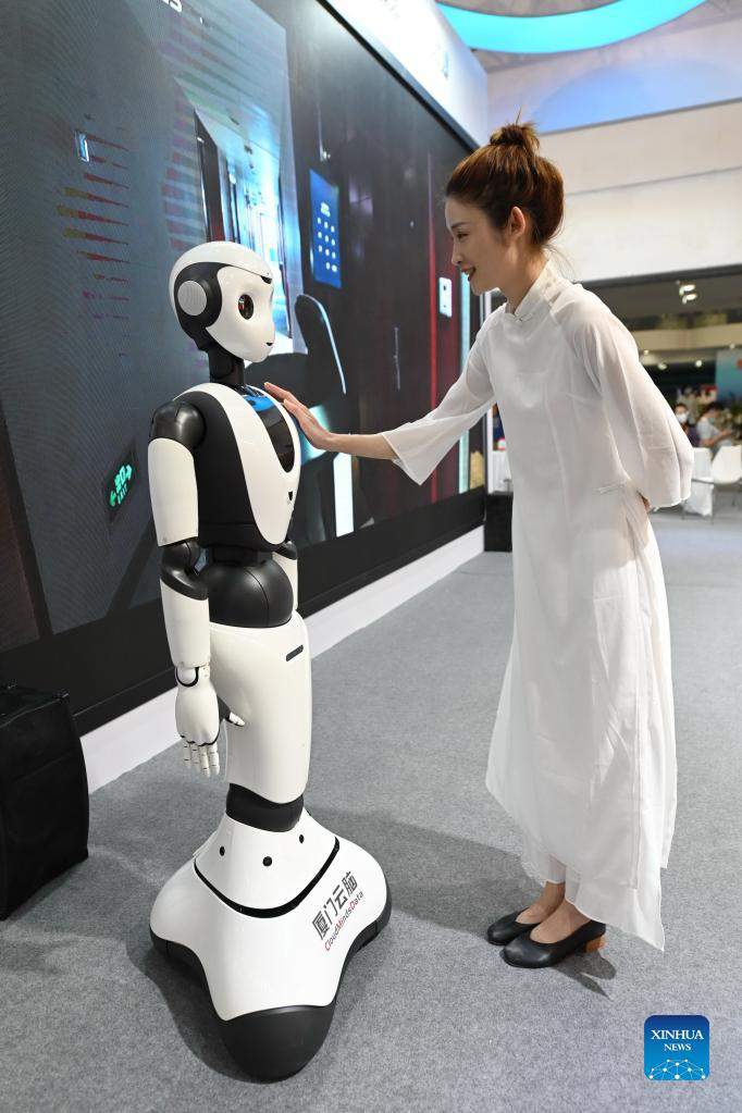 A visitor interacts with a 5G smart service android during the 21st China International Fair for Investment and Trade (CIFIT) in Xiamen, southeast China's Fujian Province, Sept. 8, 2021. The 21st CIFIT launched on Wednesday in Xiamen City. Covering more than 100,000 square meters and with strict anti-epidemic measures in place, the four-day event will attract more than 50,000 business people and over 5,000 companies from nearly 100 countries and regions both online and offline. (Xinhua/Lin Shanchuan)