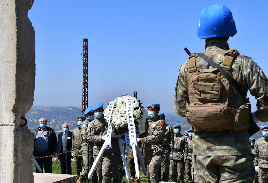 Members of the 19th batch of Chinese peacekeeping forces to Lebanon lay a wreath to pay tribute to martyrs including Du Zhaoyu on the occasion of Qingming Festival in Khiam, Lebanon, April 4, 2021. (Photo by Ding Wendong/Xinhua)