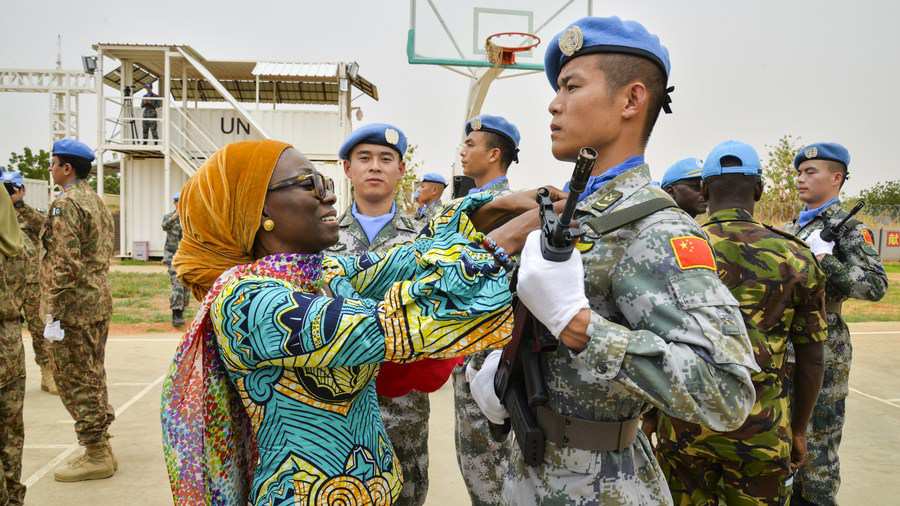 Anita Kiki Gebe, deputy joint special representative of the United Nations-African Union Mission in Darfur (UNAMID), awards UN peace medal to a soldier of the 2nd China Medium Utility Helicopter Unit (CMUHU02) in El-Fashir, Sudan, July 17, 2019. (Xinhua)