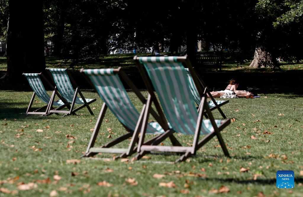 People enjoy the sunshine in St. James's Park in London, Britain, Sept. 8, 2021. (Xinhua/Han Yan)