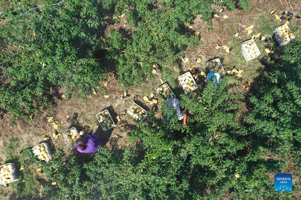 Aerial photo taken on Sept. 8, 2021 shows farmers harvesting fresh peaches in Jinli Village of Baofeng County, central China's Henan Province, (Photo by He Wuchang/Xinhua)