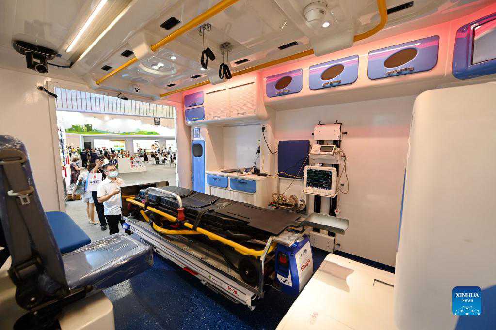 Photo taken on Sept. 8, 2021 shows an ambulance with 5G technology equipment during an exhibition on BRICS New Industrial Revolution held in Xiamen, southeast China's Fujian Province. An exhibition on BRICS New Industrial Revolution kicked off in Xiamen, a port city in southeast China's Fujian Province on Wednesday. The exhibition covers an area of 10,000 square meters. BRICS is the acronym for an emerging-market bloc that groups Brazil, Russia, India, China and South Africa. (Xinhua/Lin Shanchuan)